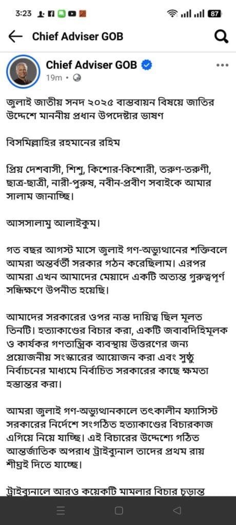জুলাই জাতীয় সনদ ২০২৫ বাস্তবায়ন বিষয়ে জাতির উদ্দেশে মাননীয় প্রধান উপদেষ্টার ভাষণ