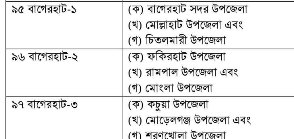 এবার পঞ্চগড়-১ ও ২, রংপুর-১ ও ৩, সিরাজগঞ্জ-১ ও ২, পাবনা-১ ও ২, বাগেরহাট-১, ২ ও ৩, সাতক্ষীরা-২, ৩ ও ৪, মানিকগঞ্জ-২ ও ৩, ঢাকা-২, ৪, ৫, ৭, ১০ ও ১৪, গাজীপুর-১, ২, ৩, ৫ ও ৬, নারায়ণগঞ্জ-৩, ৪ ও ৫, ফরিদপুর-২ ও ৪, শরীয়তপুর-২ ও ৩, ব্রাহ্মণবাড়িয়া-২ ও ৩, কুমিল্লা-১, ২, ৬ ও ১০, নোয়াখালী-১, ২, ৪ ও ৫ এবং চট্টগ্রাম-৭ ও ৮ আসনের সীমানায় পরিবর্তন আনা হয়েছে।
