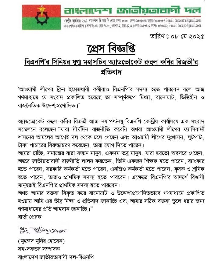 ‘আওয়ামী লীগের ক্লিন ইমেজধারী কর্মীরাও বিএনপি’র সদস্য হতে পারবেন বলে আজ গণমাধ্যমে যে সংবাদ প্রকাশিত হয়েছে তা সম্পূর্ণরুপে মিথ্যা, বানোয়াট, ভিত্তিহীন ও রাজনৈতিক উদ্দেশ্যপ্রণোদিত।’
