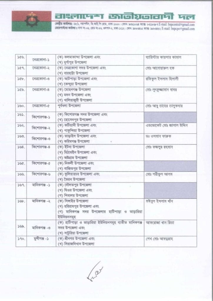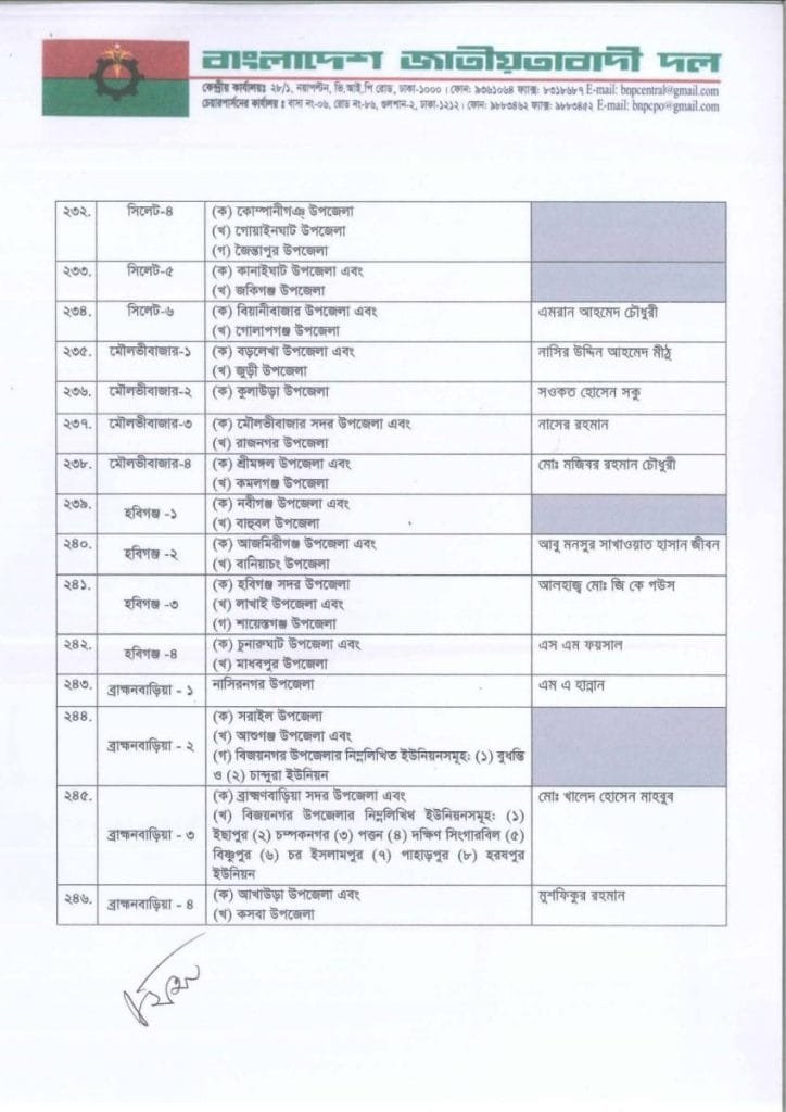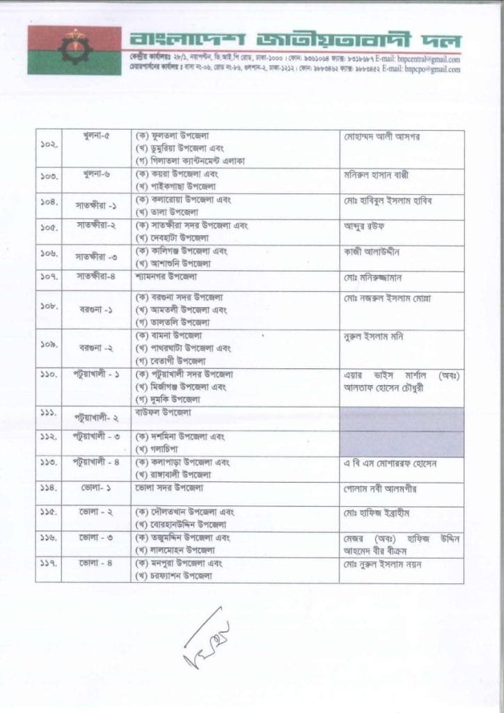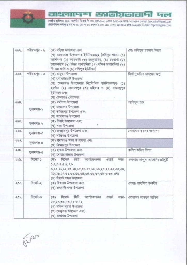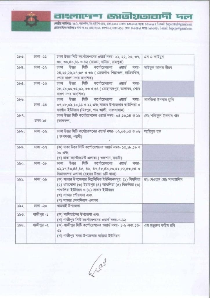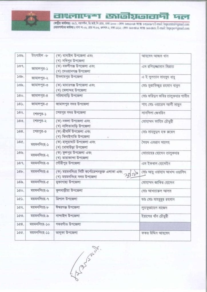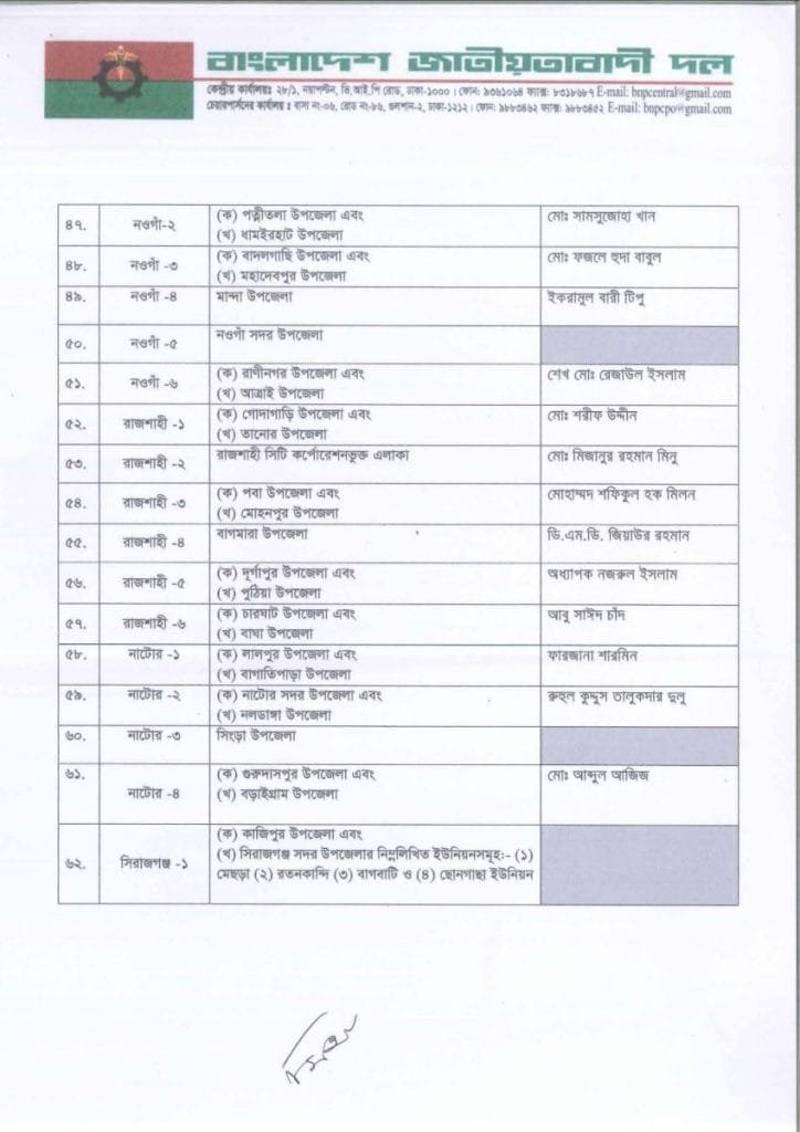 বি এন পি প্রার্থী তালিকা