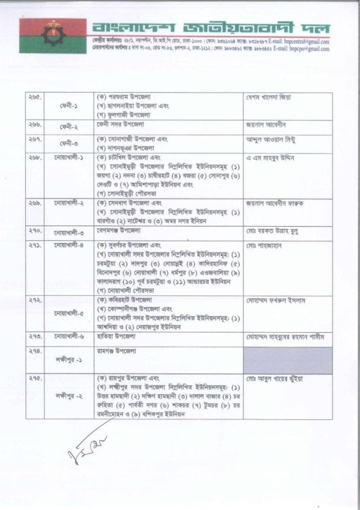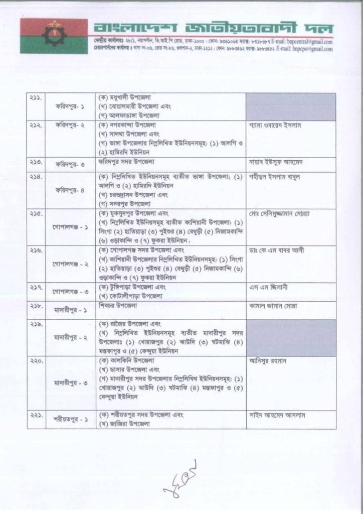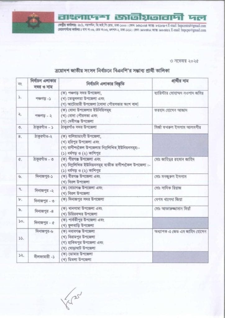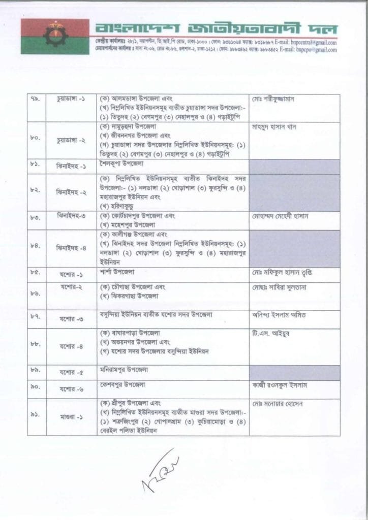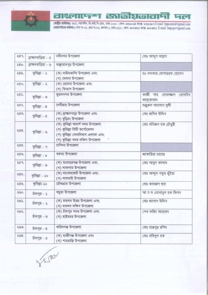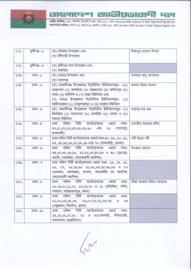 বি এন পি প্রার্থী তালিকা