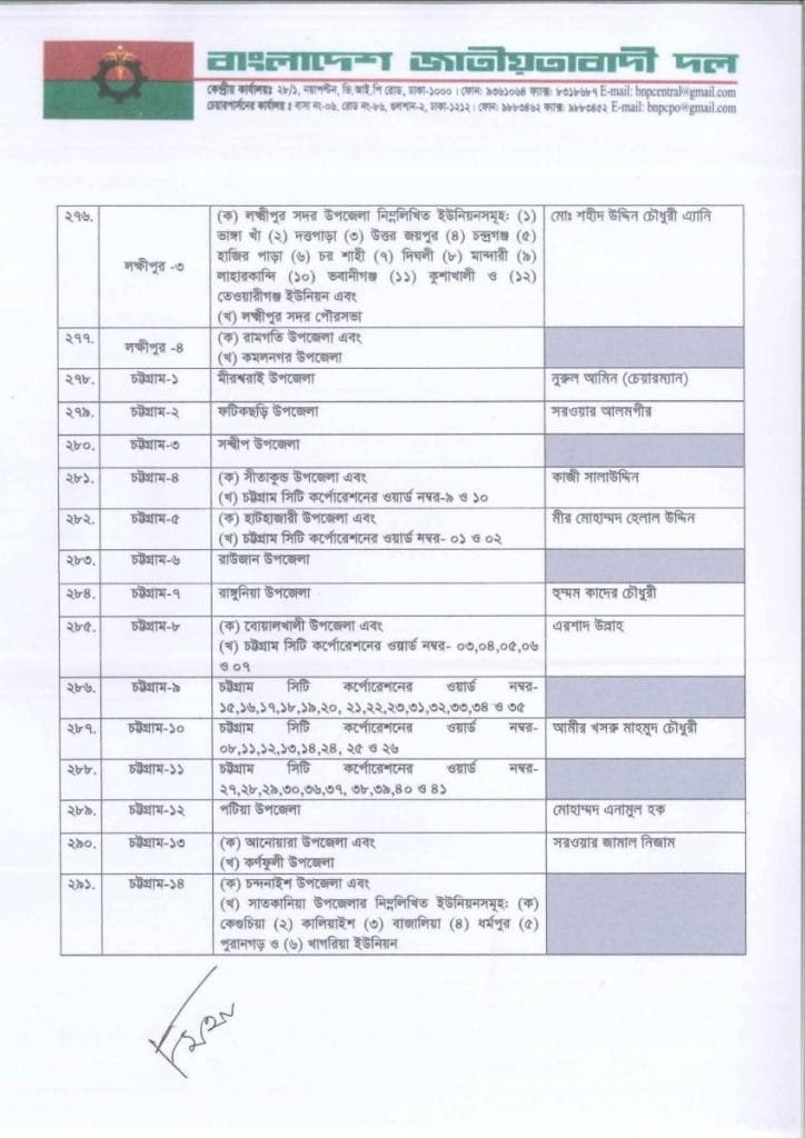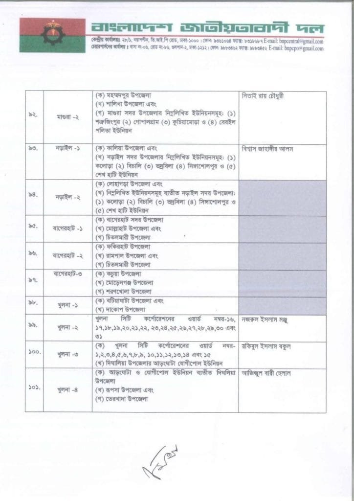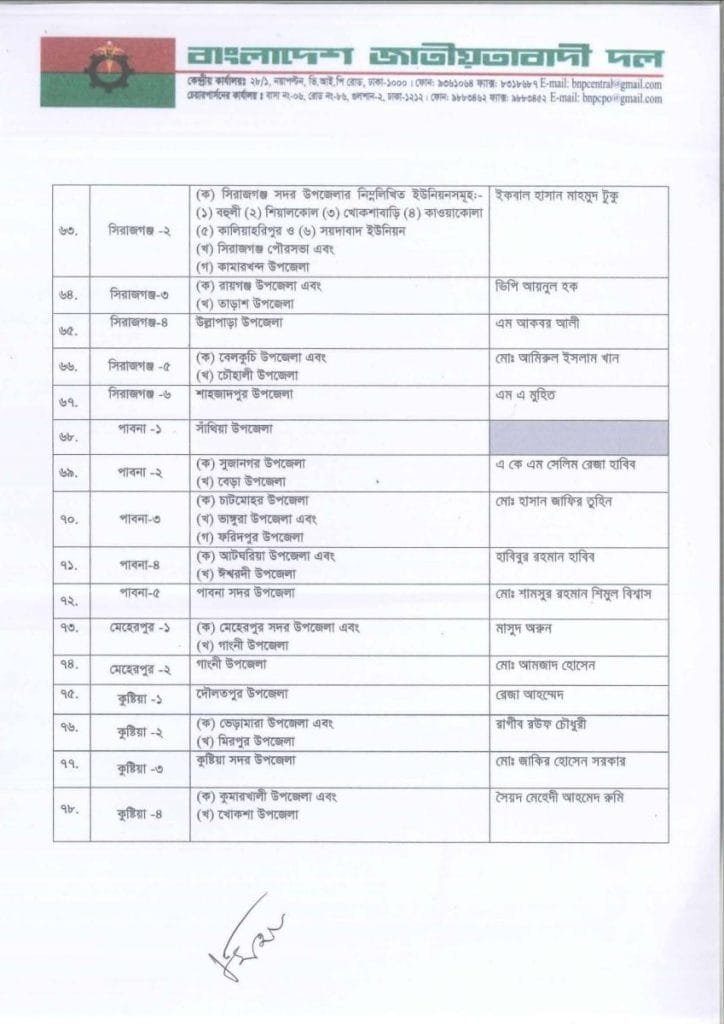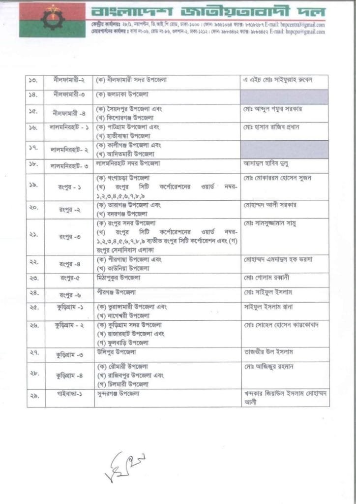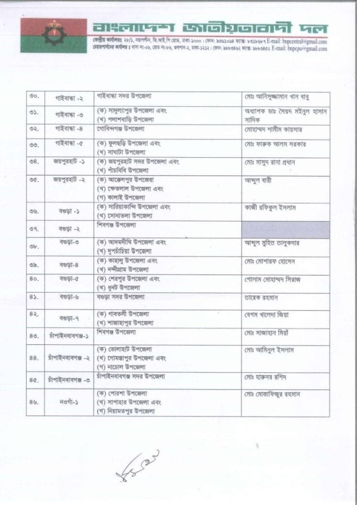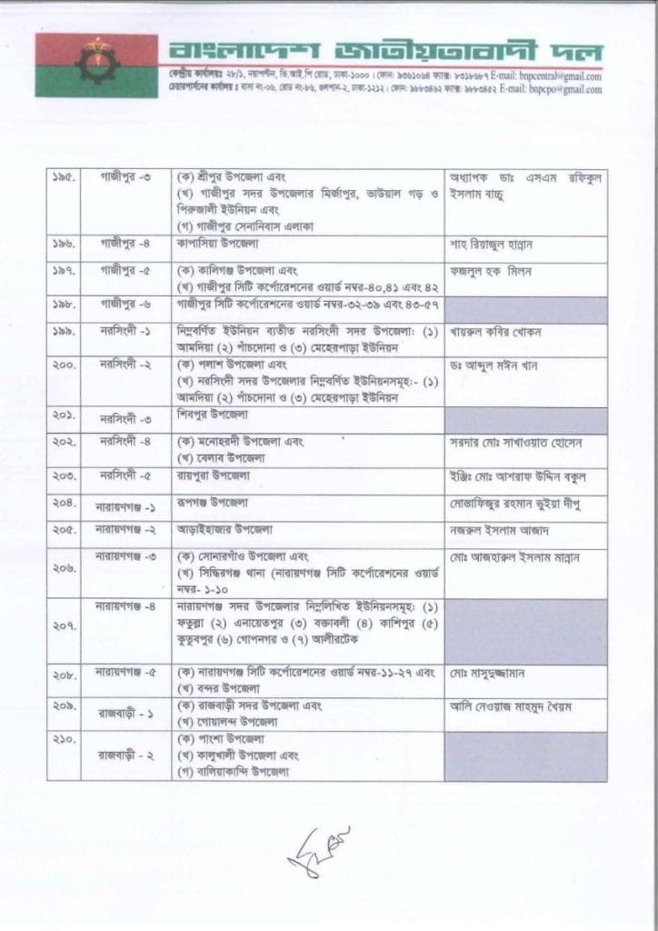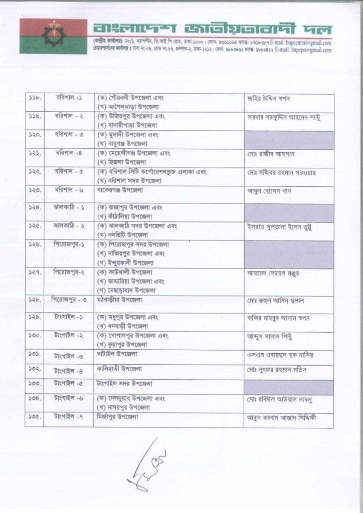 বি এন পি প্রার্থী তালিকা