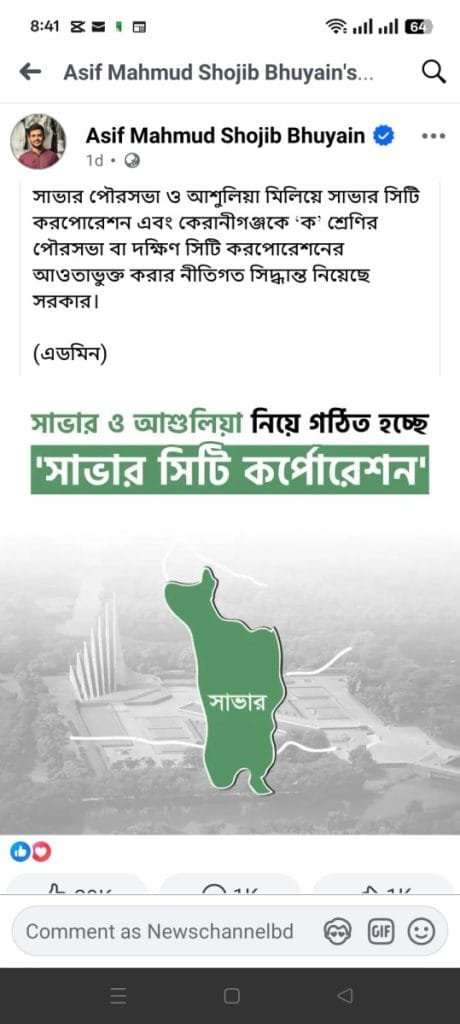 স্থানীয় সরকার উপদেষ্টা আসিফ মাহমুদ সজীব ভূঁইয়া মঙ্গলবার (২১ অক্টোবর) সন্ধ্যায় নিজের ভেরিফায়েড ফেসবুক পেজে এক পোস্টে এ তথ্য জানিয়েছেন।