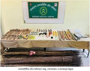 সেনাবাহিনীর যৌথ অভিযানে নারায়ণগঞ্জের আড়াইহাজার এলাকা থেকে অস্ত্র, গোলাবারুদ ও মাদকদ্রব্য উদ্ধার: আটক ৬
