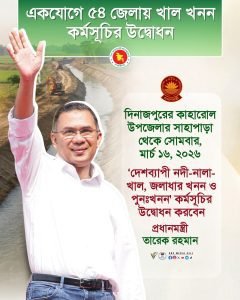 দেশব্যাপী নদী-নালা, খাল ও জলাধার খনন কর্মসূচির উদ্বোধন করবেন প্রধানমন্ত্রী তারেক রহমান